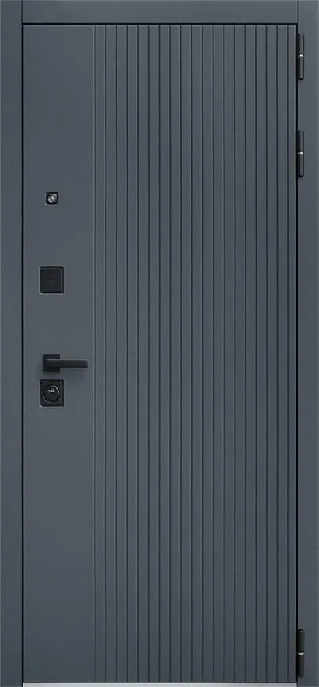 Порошковое покрытие "муар черный". Экошпонированная панель МДФ 10 мм. Линейная фрезеровка. Цвет "графит". Наличник МДФ гладкий 80 мм. Цвет "графит".