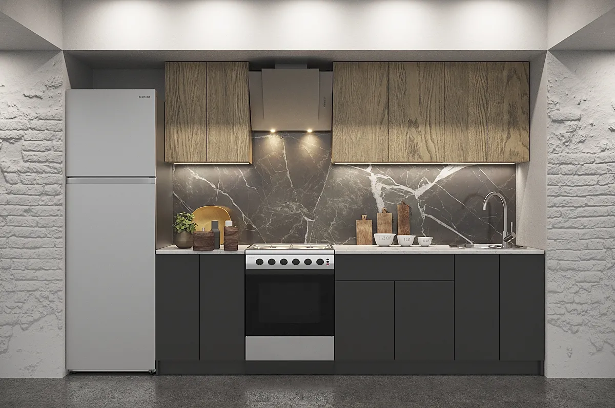 Представляем вашему вниманию изысканное решение для вашей кухни — кухонный гарнитур Белль прямая GKK1024 из коллекции "Белль". Этот гарнитур идеально впишется в любой интерьер благодаря своему прямому расположению и элегантному дизайну. Размеры гарнитура составляют 2150x2000x600 мм, что позволяет эффективно использовать пространство вашей кухни. Белый каркас, выполненный из ЛДСП, создает светлую и легкую атмосферу. Фасады, доступные в цветовых сочетаниях "Роза, Графит", "Обриета, Торроне", "Спумони, Графит", изготовлены из высококачественного МДФ и покрыты пленкой ПВХ, придающей поверхностям дополнительную износостойкость и элегантный вид.